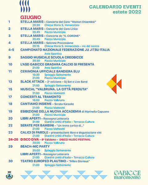 Il calendario degli eventi 2022 è realizzato grazie alla collaborazione del tessuto associativo del territorio con il quale il Comune di Gabicce Mare collaborerà con dei contributi concessi a seguito di una procedura pubblica.