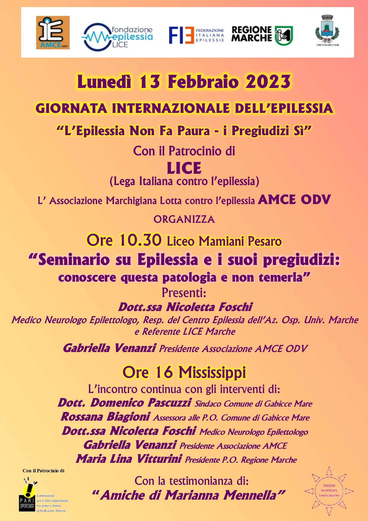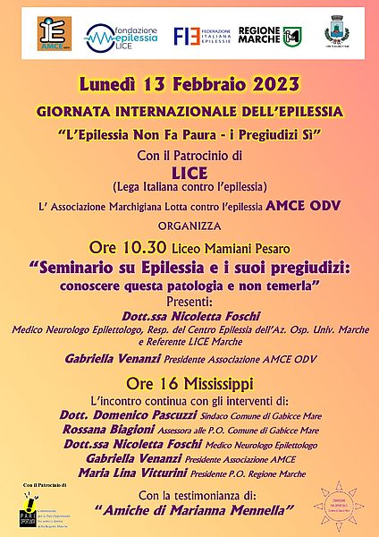 Il seminario gode del Patrocinio di: LICE (Lega Italiana contro l’epilessia), Fondazione Epilessia LICE, Federazione Italiana Epilessia, Regione Marche, Commissione per le Pari Opportunità tra Uomo e Donna della Regione Marche, Comune di Gabicce Mare.