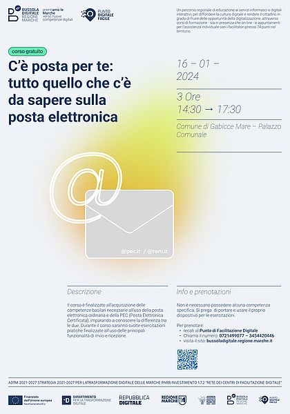 Il secondo corso avrà come tema: "C'è posta per te: tutto quello che c'è da sapere sulla posta elettronica"e si terrà in presenza Martedì 16/01/2024 dalle 14:30 alle 17:30 presso la Sala del Consiglio Comunale.
