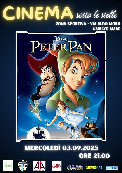 Torna l'ultimo appuntamento di questa estate della rassegna "Cinema sotto le stelle". Nella zona sportiva in Via Aldo Moro mercoledì 3 settembre alle ore 21.00 verrà proiettato il cartone animato Peter Pan, un classico Disney senza tempo che racconta la storia di Peter e Wendy e le loro avventure sull'Isola che non c'è per sconfiggere Capitan Uncino.