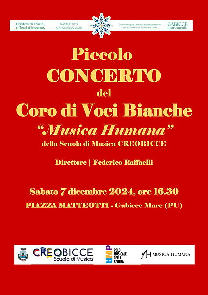 Il Coro di Voci Bianche “Musica Humana” della Scuola di Musica Creobicce si esibirà anche quest’anno con un piccolo concerto di canti tradizionali natalizi sabato 7 dicembre alle ore 16.30. Divenuto oramai un appuntamento tradizionale, quest'anno si terrà in Piazza Matteotti.
