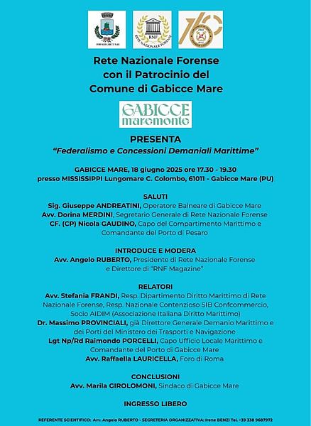 Interveranno: l'Associazione Italiana Diritto Marittimo e il presidente della Rete Nazionale Forense con le conclusioni della sindaca Marila Girolomoni