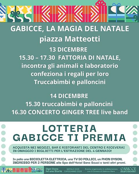 Durante tutto il periodo sarà attiva anche la lotteria “Gabicce ti premia”, che permetterà a chi acquista nei negozi, bar e ristoranti del centro di ricevere in omaggio i biglietti per l’estrazione del 4 gennaio. In palio una bicicletta elettrica, una TV da 50 pollici, un phon Dyson e un ingresso per due persone alla Spa dell’Hotel Sans Souci, per un Natale ancora più speciale.