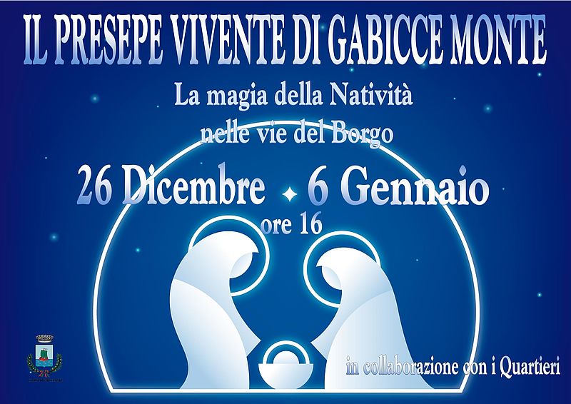 Mercoledì 26 dicembre e domenica 6 gennaio, dalle ore 16, Gabicce Monte si trasformerà con la tradizionale rievocazione del Presepe Vivente, grazie ad allestimenti a grandezza naturale, nella splendida cornice di un borgo affacciato sul mare.