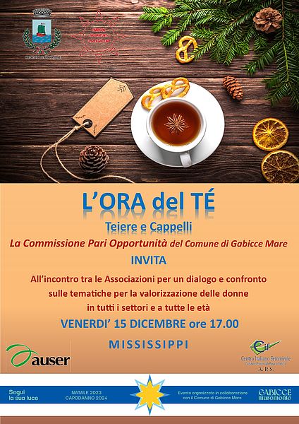 Proprio all'ora del tè le associazioni del territorio e la Commissione Pari Opportunità del Comune di Gabicce Mare si riuniscono per fare una riflessione sui tempi che sono cambiati, sull'abbigliamento delle donne che ancora oggi però in tanti paesi del mondo deve rispecchiare un canone ben preciso di sottomissione e copertura. Venerdì 15 dicembre alle ore 17.00 al Mississippi sarà un momento di riflessione sulle attività future che le associazioni e le loro tante volontarie possono fare come percorso insieme per il miglioramento della condizione femminile con iniziative e opportunità affinché ci sia una consapevolezza sul ruolo della donna e sulla sua condizione.