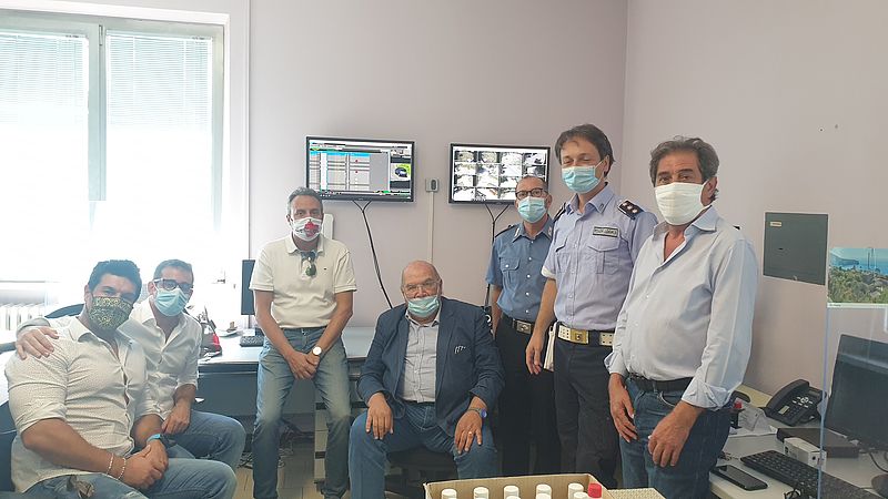 Nella foto da sinistra: Thomas Lenti, Filippo Gasperi, Domenico Pascuzzi, Fausto Caldari, Cesario Indino, Luciano Loccioni e Aroldo Tagliabracci nella centrale operativa della Polizia Locale.