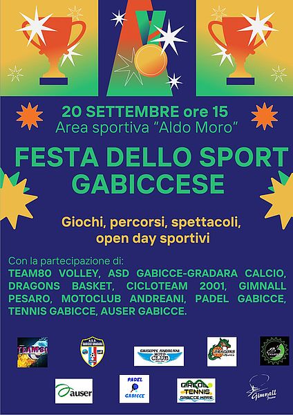 A Gabicce Mare sta per partire la Festa dello Sport Gabiccese, la manifestazione organizzata in collaborazione con le associazioni sportive e l’Assessorato allo Sport, in programma sabato 20 settembre 2025 a partire dalle ore 15.00 presso il centro sportivo "Aldo Moro". Protagoniste saranno tutte le società e Associazioni sportive del territorio che offriranno un’ampia vetrina delle discipline sportive e metteranno a disposizione proprio personale e volontari per organizzare un pomeriggio di festa e gioco.