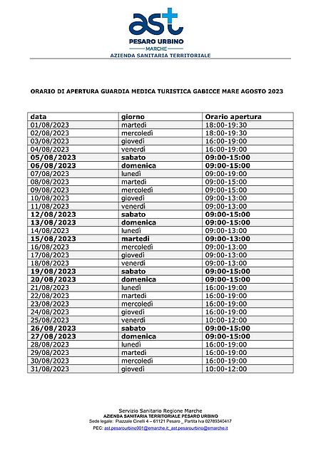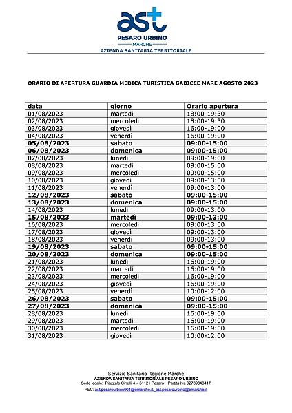 Si avvisa che nel mese di Agosto sono stati comunicati i nuovi orari della Guardia Medica Turistica.