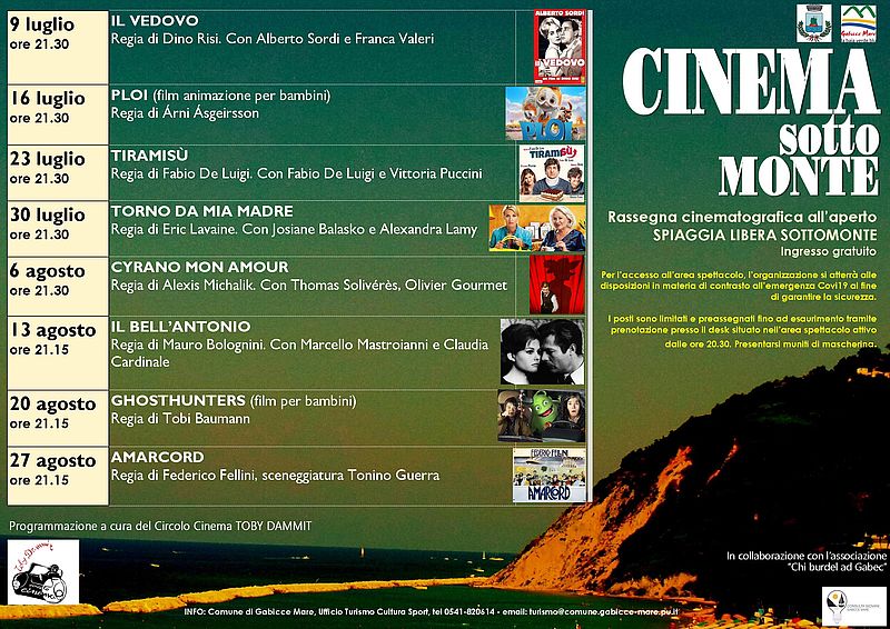 Appuntamento a Gabicce Mare con il Cinema Sottomonte, che propone nei mesi di luglio e agosto un’attenta e varia selezione per vedere e rivedere i migliori film del passato e delle recenti stagioni. Capolavori d’essai, vecchie pellicole, film per bambini, il cinema italiano popolare…tutti i titoli più amati dal pubblico. Tutti gli spettacoli sono gratuiti.